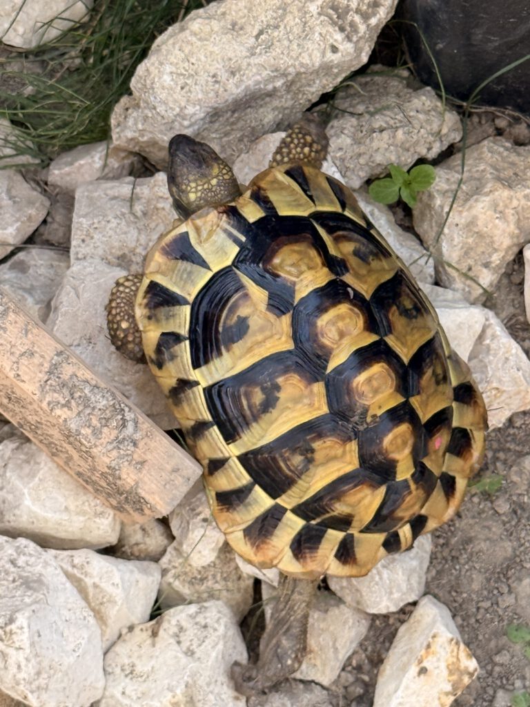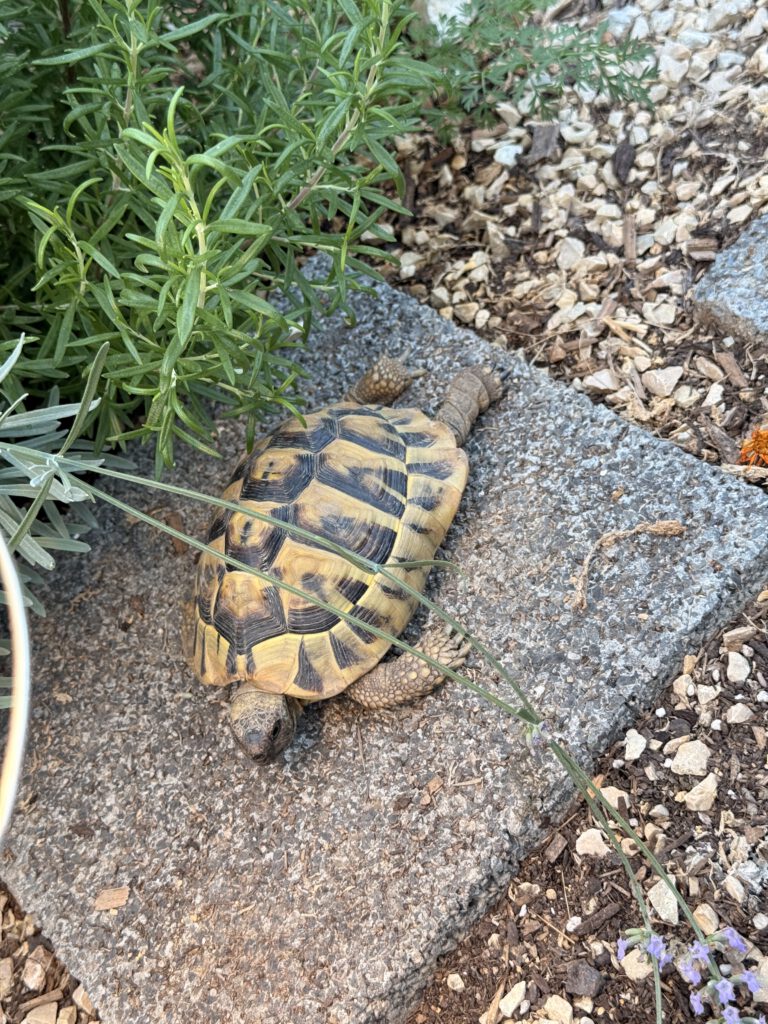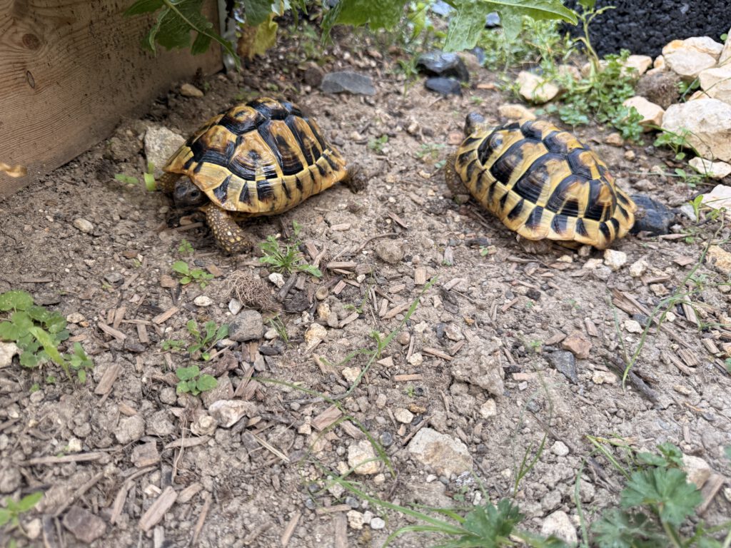 Als Freizeitbeschäftigung im Garten und als Beobachtungsruhepol halten wir zwei griechische Landschildkröten in unserem Garten.